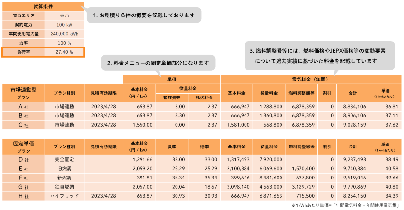 エネチェンジBizでは、電力会社ごとの電気代を簡単に横比較できる比較表をご提出しています。電気料金の単価で比較しているため、使用量にかかわらず、最も安い電力会社が一目で分かります。